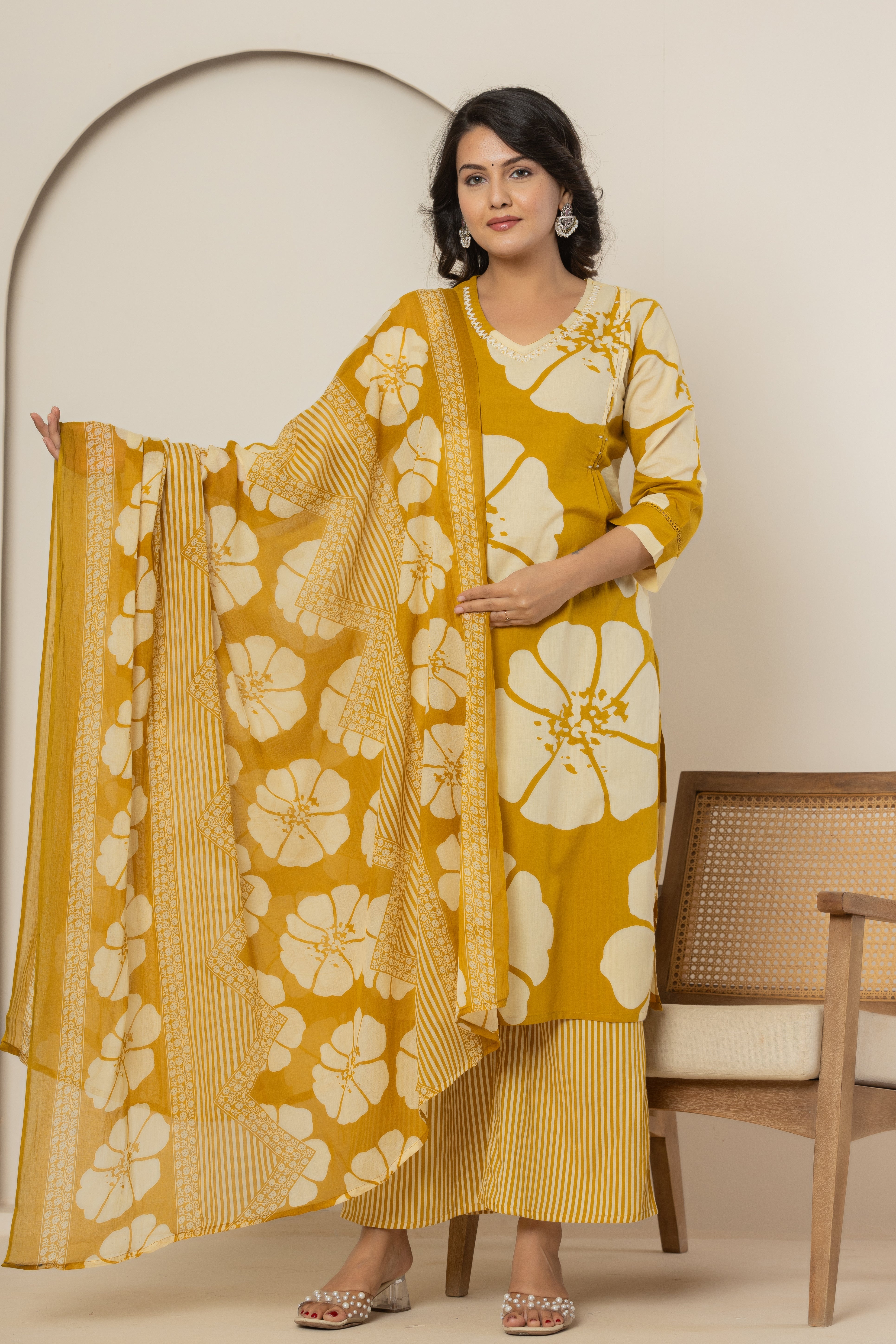 Add a touch of vibrant elegance to your sleepwear collection with the Golden Blossom Women's Dupatta Cotton Sleepwear Set. Featuring a cheerful yellow floral print, this set includes a beautifully designed cotton top and pants, paired with a matching dupatta for an added touch of charm. The soft, breathable fabric ensures all-night comfort, while the lively floral design brings a refreshing, feminine vibe to your bedtime routine.