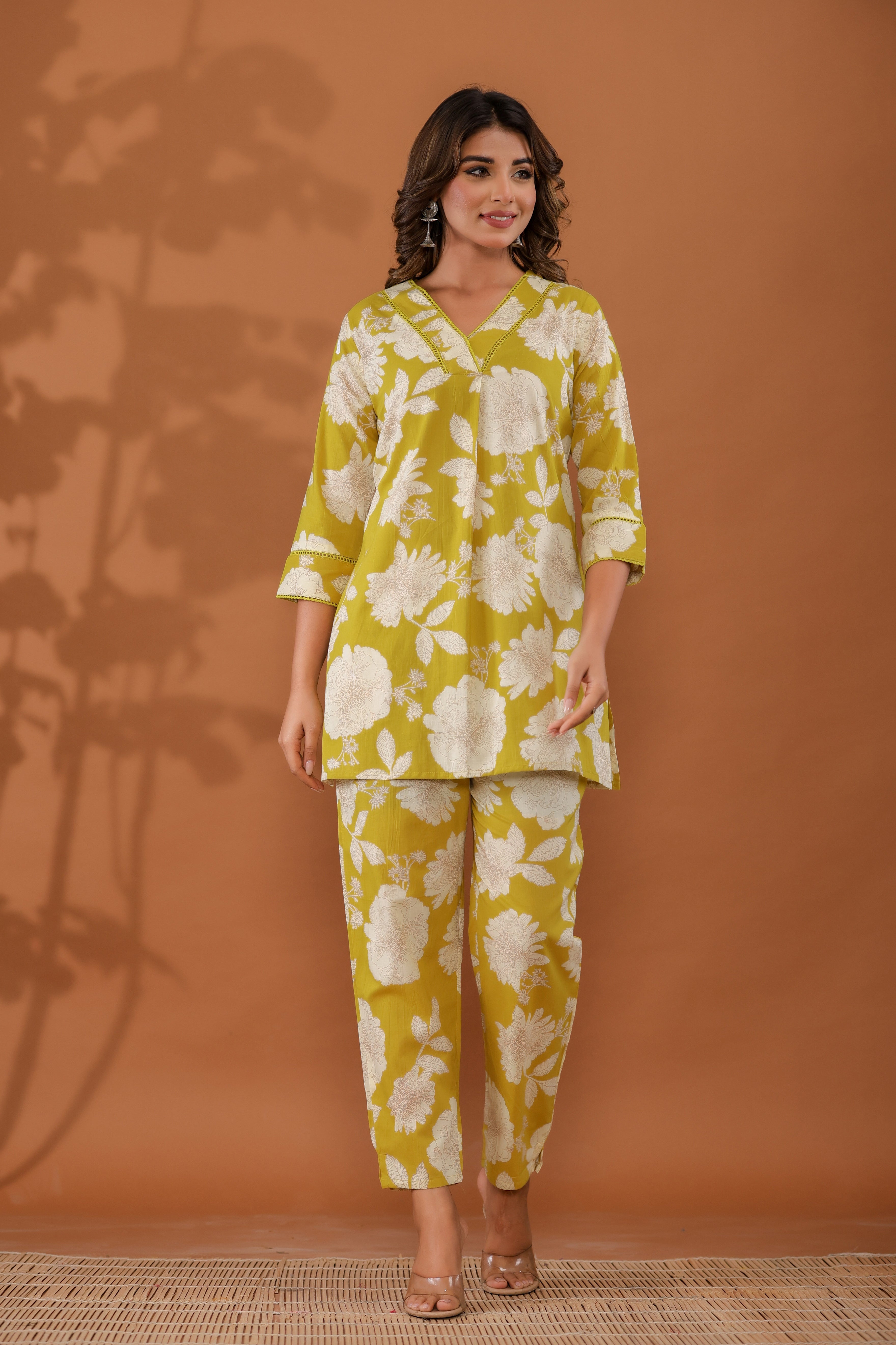 Add a burst of brightness to your loungewear with the Sunny Bloom Women’s 2-Piece Cotton Cord Set. Made from 100% premium cotton, this set features a vibrant yellow and white floral design, blending sunny warmth with a fresh, floral pattern. The breathable fabric ensures comfort all day, while the relaxed-fit top and matching pants provide the perfect balance of style and ease. Ideal for lounging, relaxing, or enjoying a peaceful night’s sleep, the Sunny Bloom set brings a touch of cheerfulness and elegance to your wardrobe.